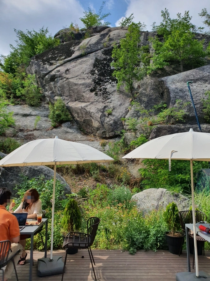 테라스 바로 옆으로는 산 자락의 높은 절벽이 위치하고 있다. 원래 이런 지형이었던건가..?